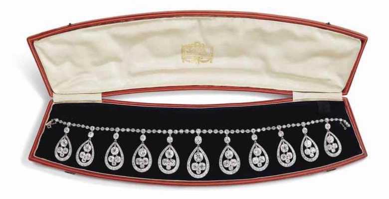 Collar de diamantes Cartier París. Circa 1900, montura de platino y diamantes talla antigua con patrón móvil en forma de pera. Vendido por 1.418.500 euros, doblando el precio estimado.